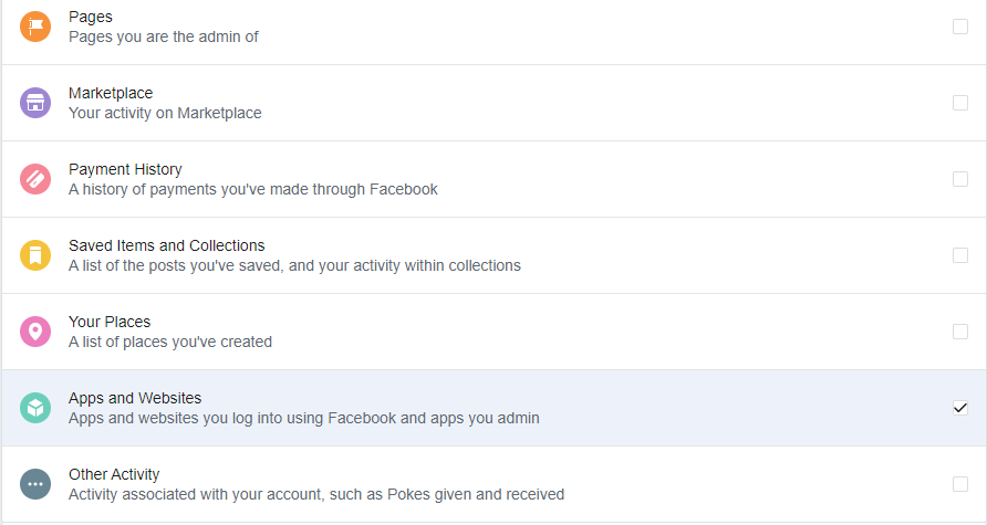 - Uncheck the boxes of anything you don’t want to download (I unchecked everything except “Photos and Videos” and “Apps and Websites.” The latter is important if you need to know what all apps and websites are connected to your Facebook account, since you’ll want to change login information on those apps and websites).