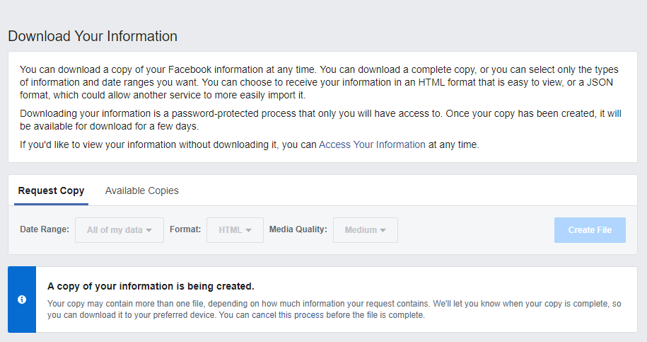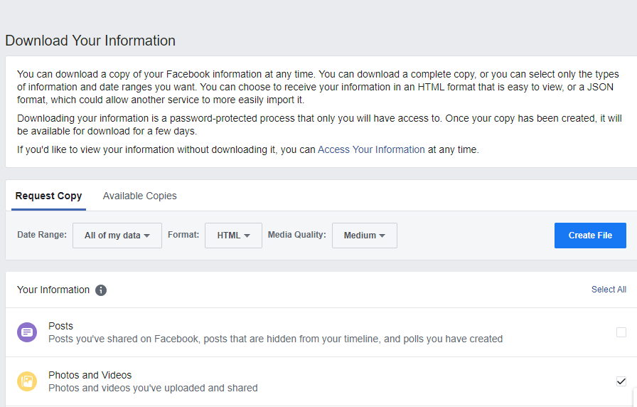 - Once you have checkmarks only in the boxes of the things you want to download, make sure you select your desired file format (I selected “HTML”) and media quality (I selected “High”), and click “Create File.”